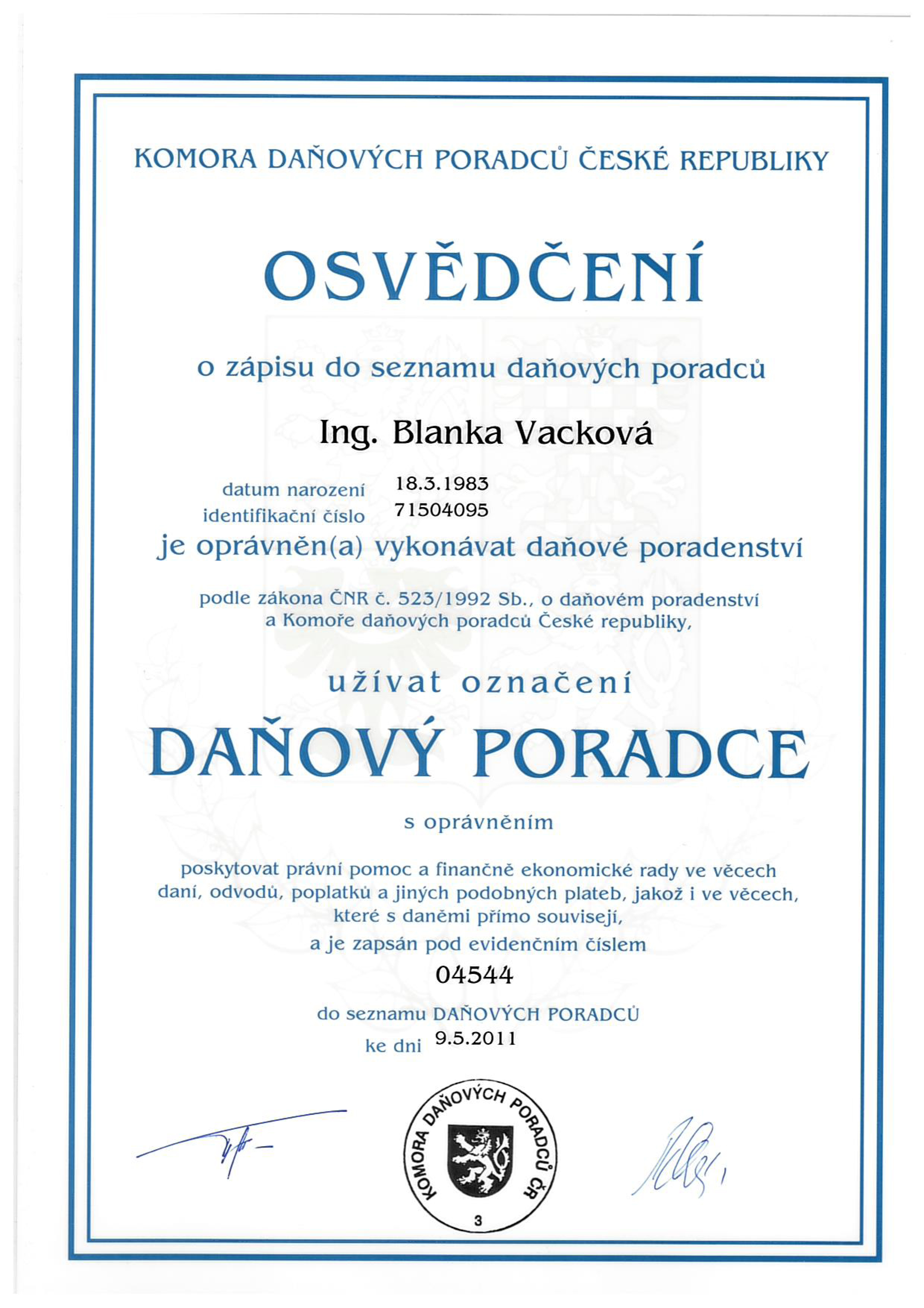 Komora daňových poradců České republikyOSVĚDČENÍ O ZÁPISU DO SEZNAMU DAŇOVÝCH PORADCŮ (Ing. Blanka Vacková)